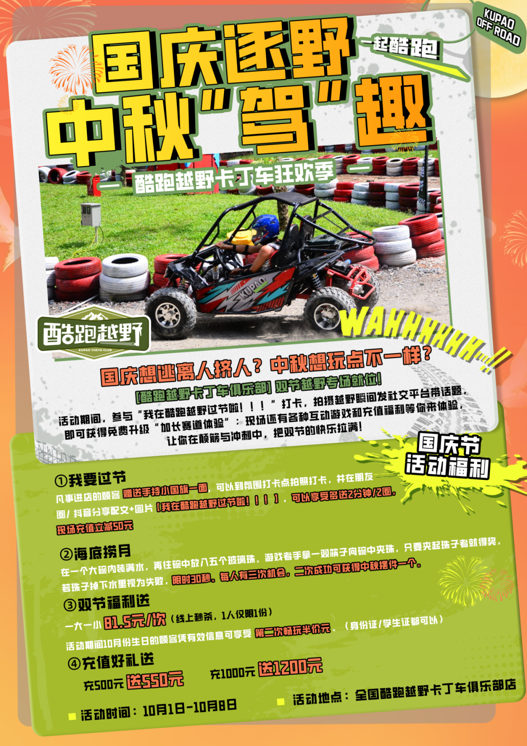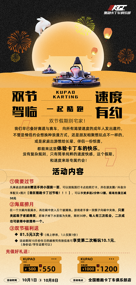 各地门店特别策划「国庆限定」活动,为你的假期增添一份独特记忆。速度、激情与欢乐,将在这个假期全面点燃!